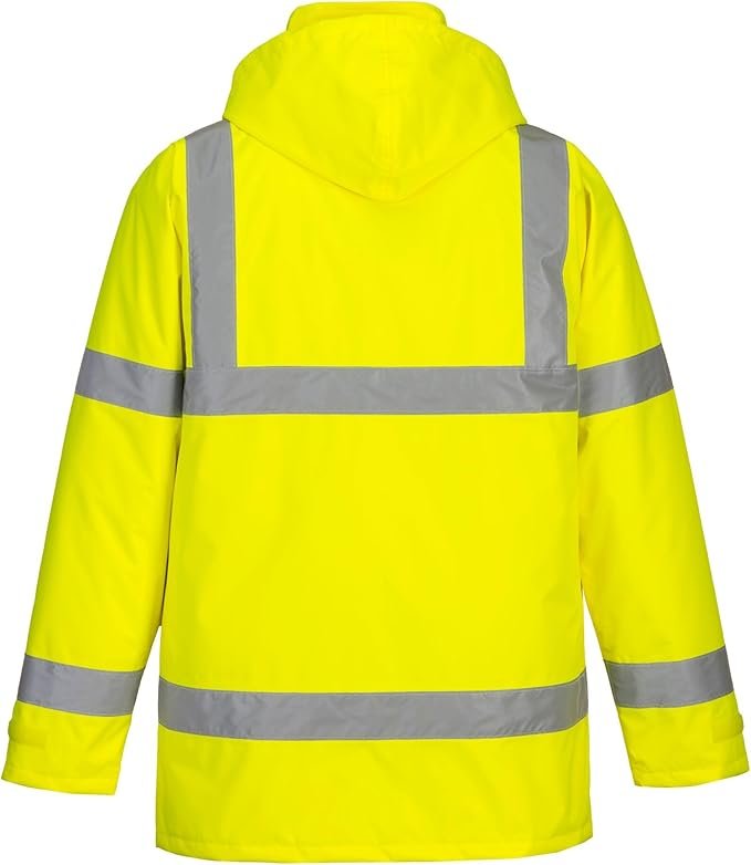 Parka Portwest haute visibilité S460, imperméable et chaude, avec bandes réfléchissantes, capuche repliable et coutures étanches. Idéale pour les travaux extérieurs sous la pluie et le froid.